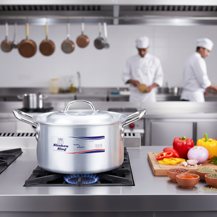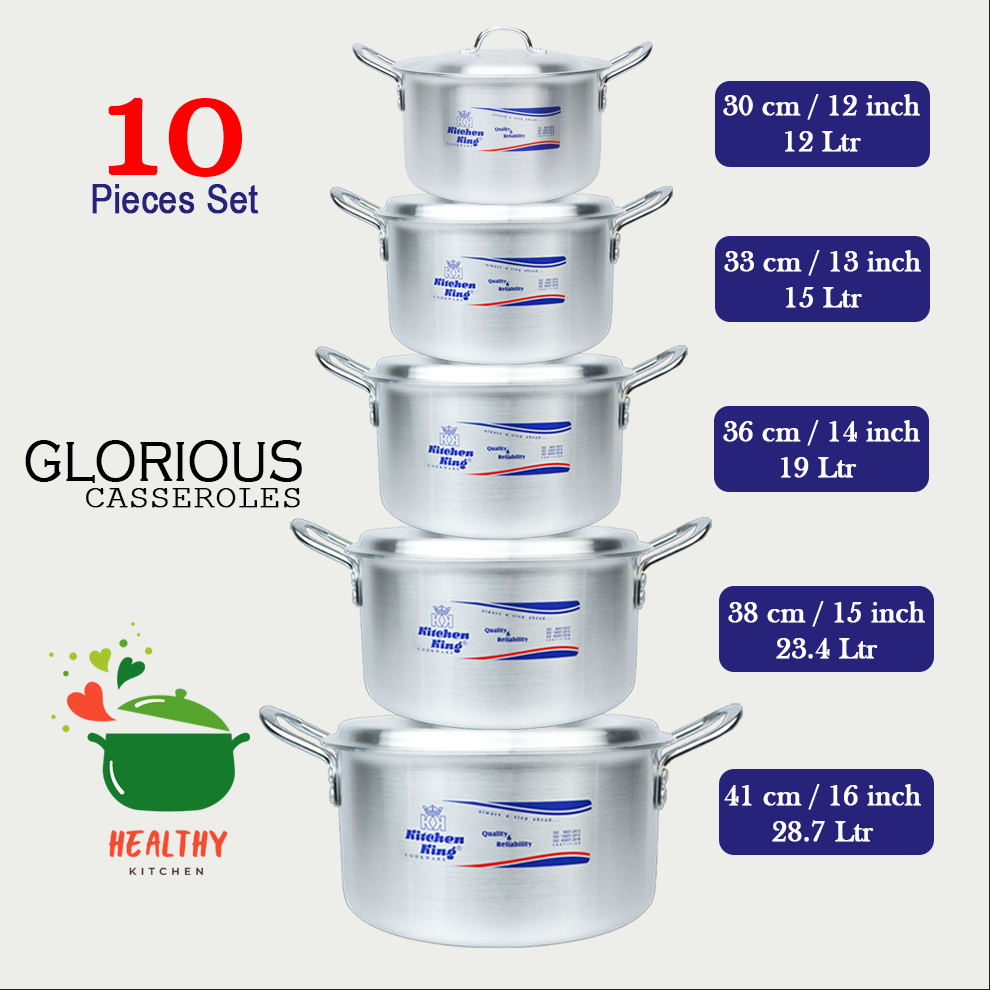 Elevate your kitchen game with the “Glorious” Casserole Set. Designed for those who cook for big families or love to host, this 10-piece collection combines professional-grade durability with a sleek, polished finish. Professional chefs prefer aluminium for its scientific advantages in heat management. The thick-gauge construction ensures heat spreads evenly from the base up through the side walls, so the top of your stew cooks just as thoroughly as the bottom. The attractive ergonomic handles with a smooth finish are riveted for maximum control and a stable grip.
