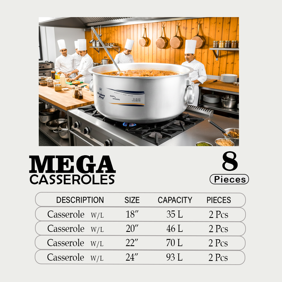When a standard kitchen pot isn’t enough, these “big body” pots are designed for heavy-duty cooking, whether its your family big gathering or your restaurant kitchen. Our cookware delivers higher performance when making a variety of dishes such as curry, fish, meat or vegetables and ensures its effortless food release. Mega casseroles set that been specifically developed to meet the needs of today’s commercial kitchens. It is ideal for ambitious chefs due to its outstanding heat distribution and simplicity of food release. It is manufactured from heavy gauge high quality pure aluminium which gives more durability and a stylish appearance in your kitchen. The sturdy handles with a smooth finish are riveted for maximum control and a stable grip. We recommend the use of little oil for extra ease of release of food. Our cookware is suitable for gas stove tops. Hand wash is recommended to preserve the appearance of cookware.