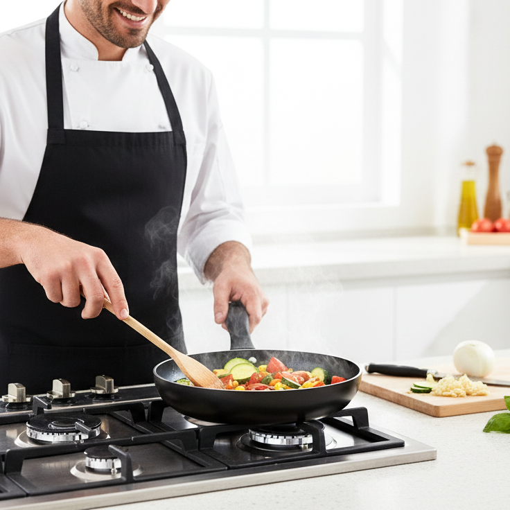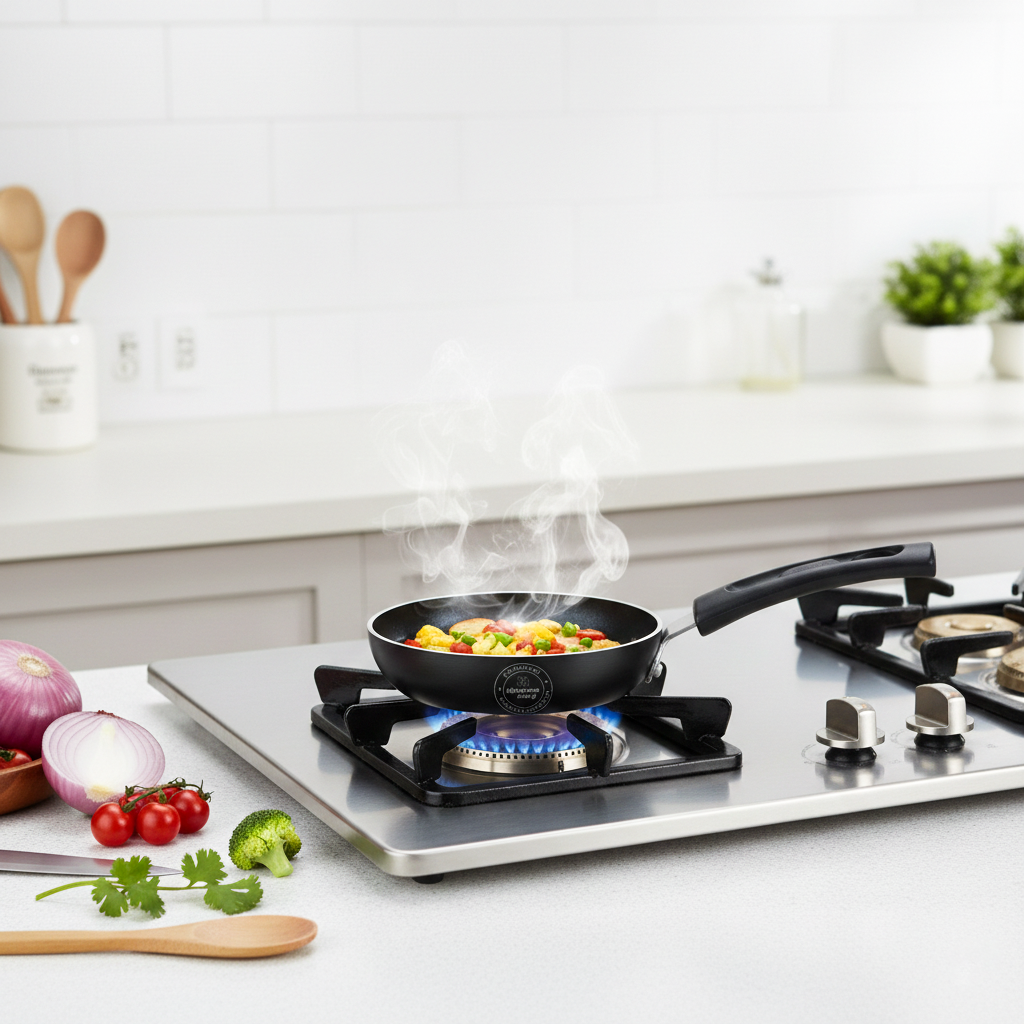 Fry, flip or sauté in style with our trendy, classic and modern collection of frying pans. A perfect stylish body of our non-stick frying pan is manufactured from heavy gauge high quality pure aluminium which ensures even heat distribution for better cooking and results in fantastic performance throughout in kitchen. The use of premium 2x layer of non-stick coating (PFOA free) prepares healthier meals without the release of any harmful toxins or fumes and certifies the release of food easily. The heat-resistant and ergonomic handle with a smooth finish is riveted to give strong grip and luxurious exterior look. Our cookware is suitable for gas and electric glass stovetops. Dishwasher safe but hand-washing is recommended to preserve the appearance of cookware.