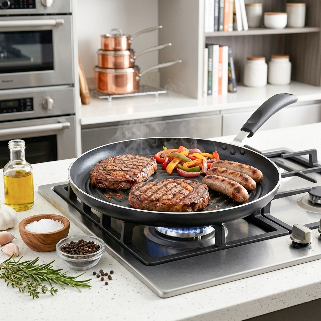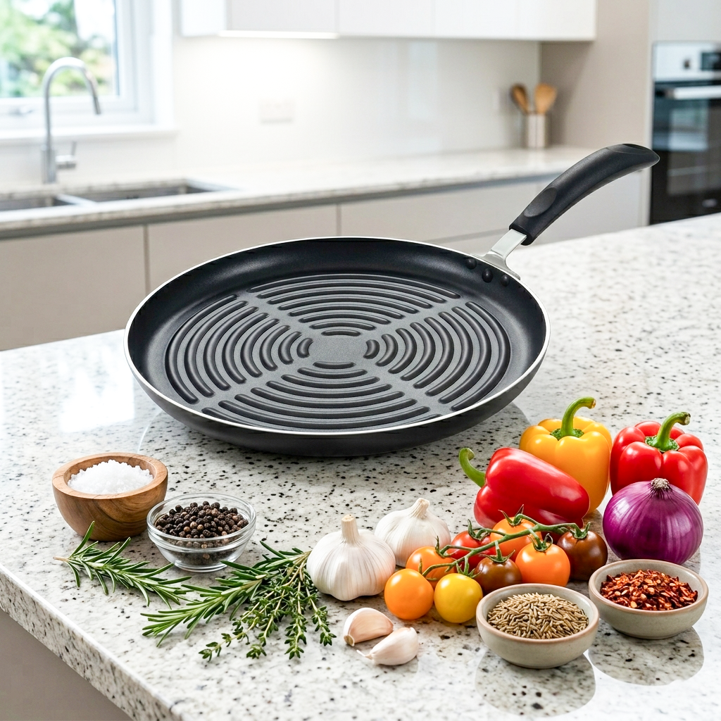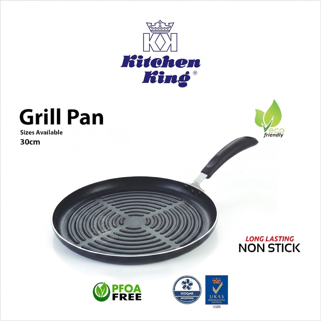 Kitchen King cookware grill pan is one of the must-haves in any kitchen. It is the best in the business when it comes to grilling. The best and long lasting non-stick (PFOA free) surface along with ridges are to drain oil and fat which ensures that fish, chicken, meat or veggies and many more can cook to perfection. A perfect stylish body is made from heavy gauge high quality pure aluminium which ensures excellent heat distribution for better cooking and results in fantastic performance throughout in kitchen. The heat-resistant and ergonomic handles with a smooth finish is double riveted to give strong grip and luxurious exterior look. Our cookware is suitable for gas and electric glass stovetops. Dishwasher safe but hand-washing is recommended to preserve the appearance of cookware.
